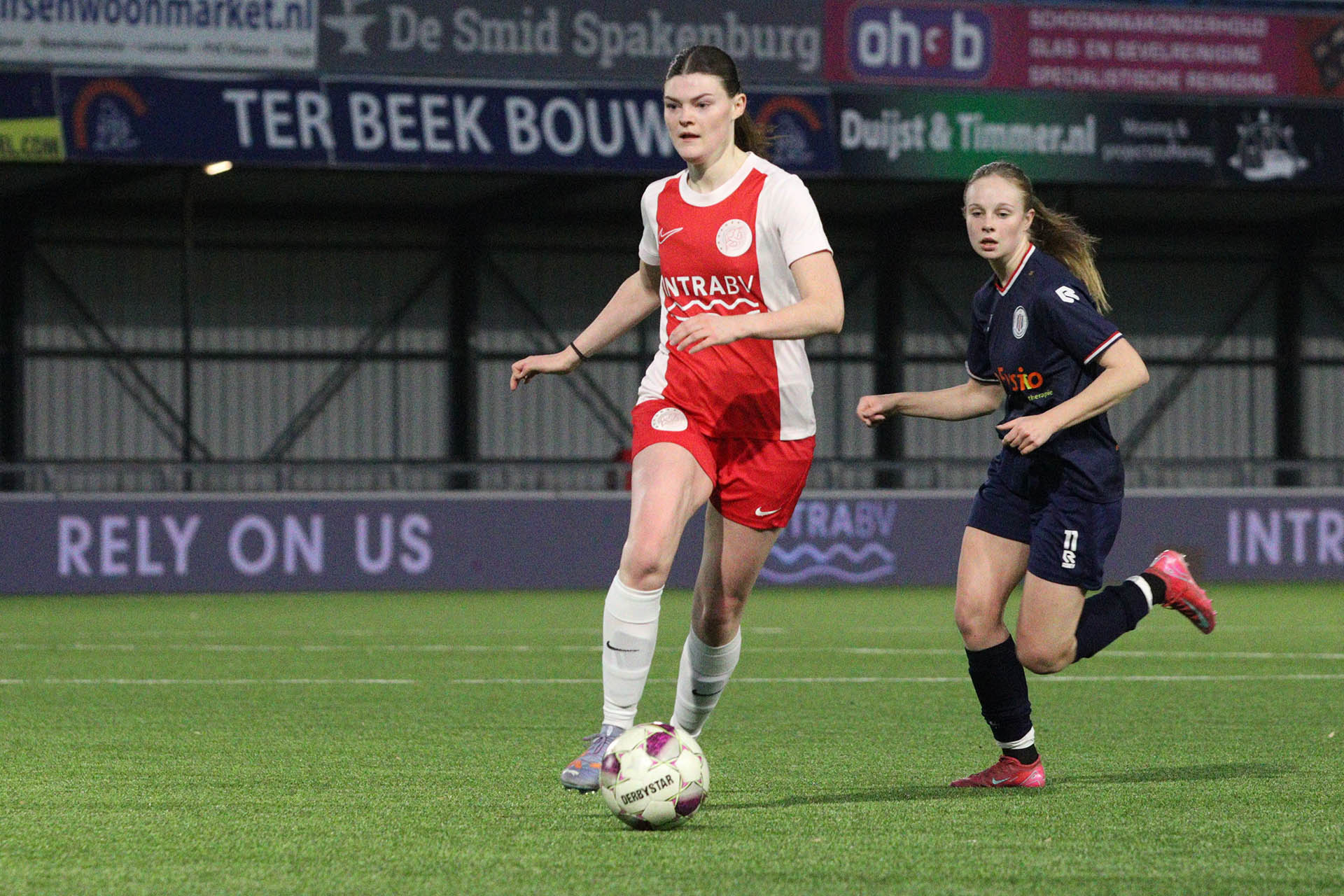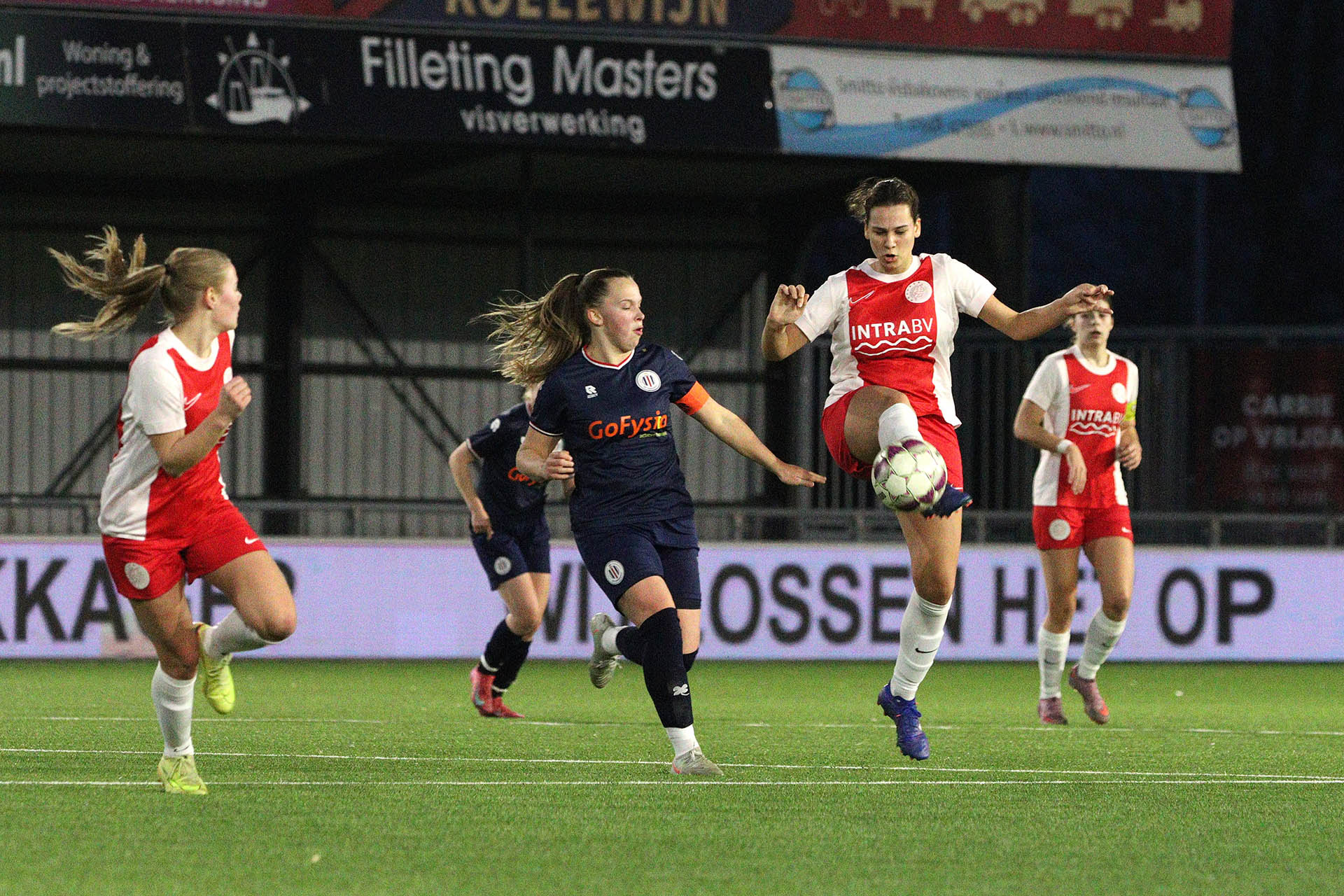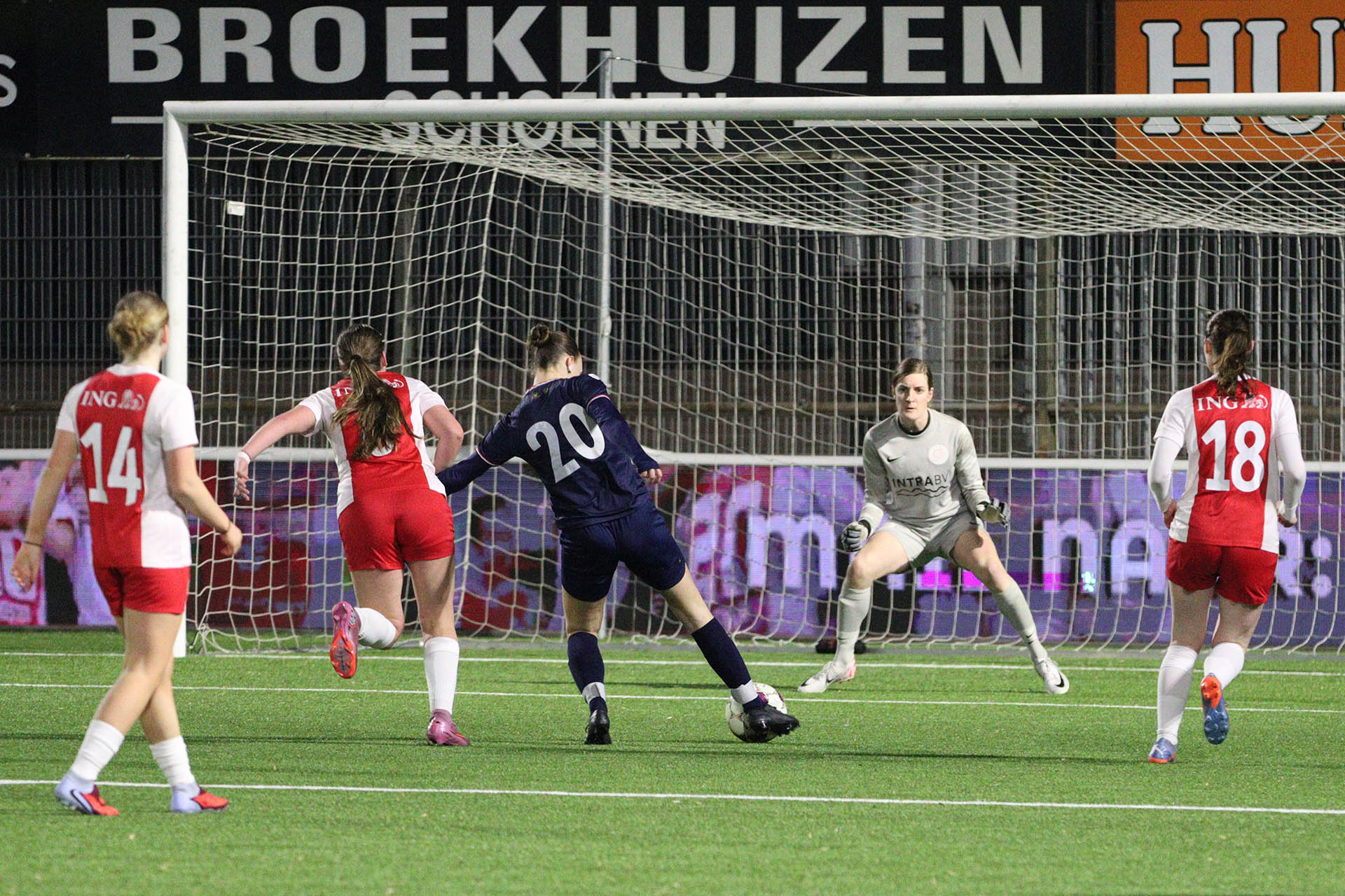 | Mia Beukers maakt het Naomi Gerritse moeilijk om af te ronden, terwijl ook keeper Jonne Odding op scherp staat. |